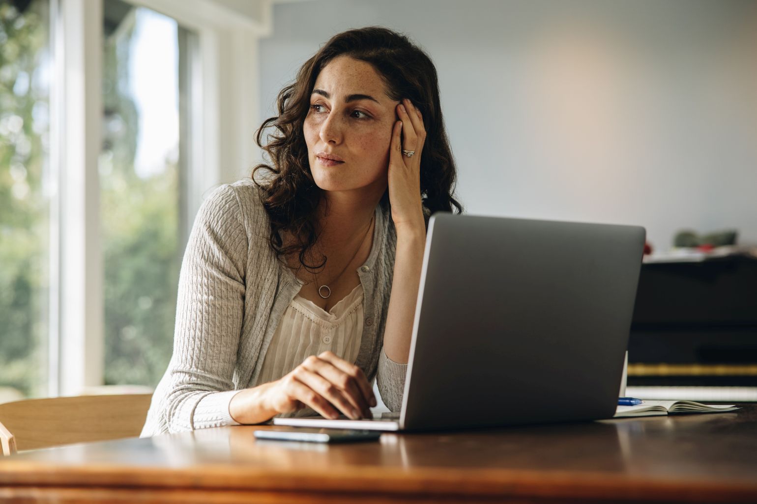 Eine Frau mit Handy in der Hand blickt lächelnd nach oben